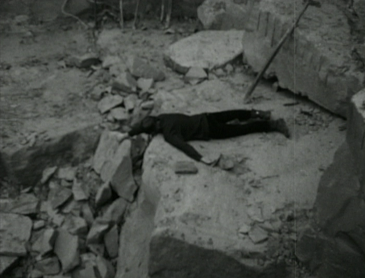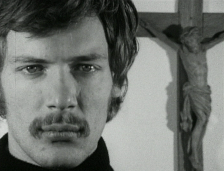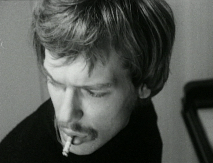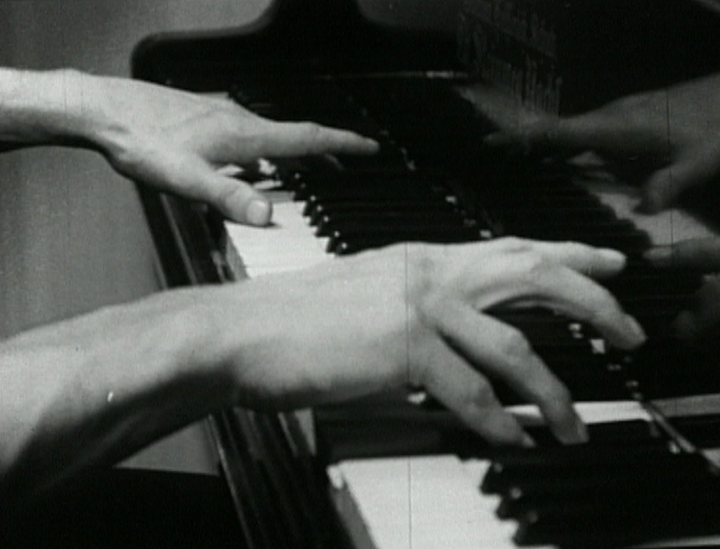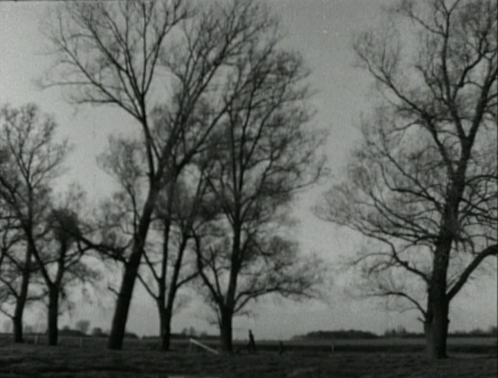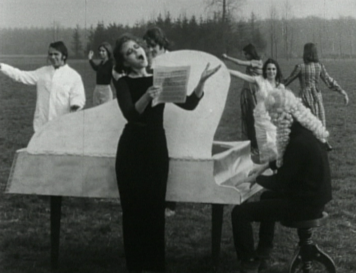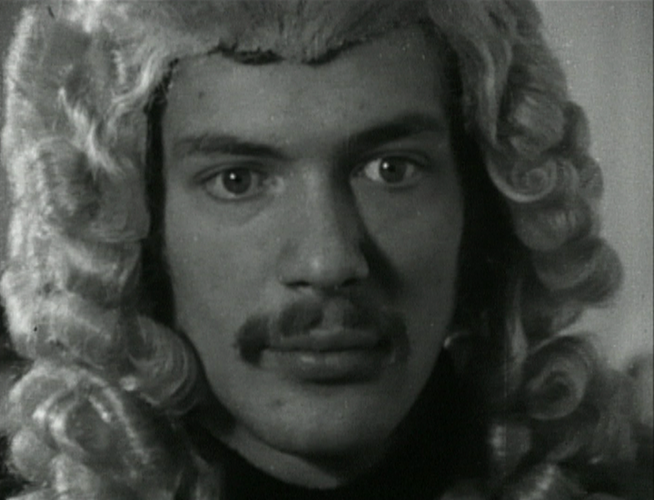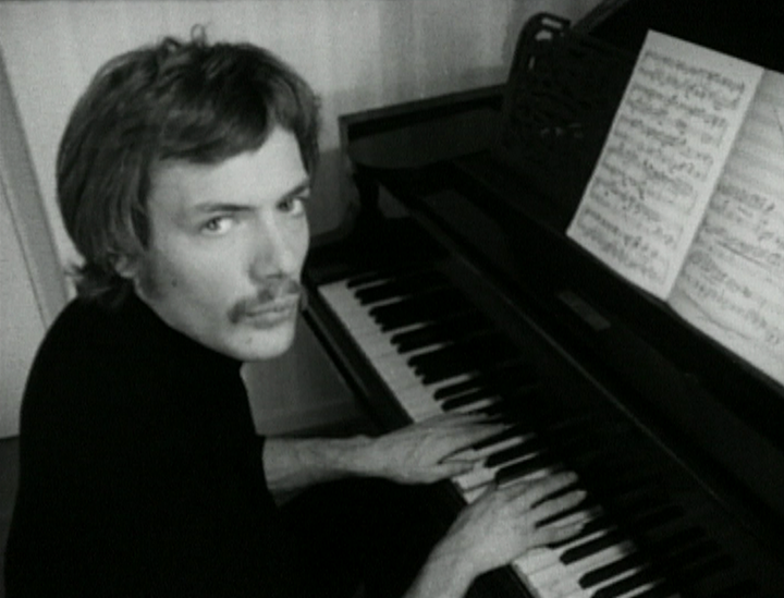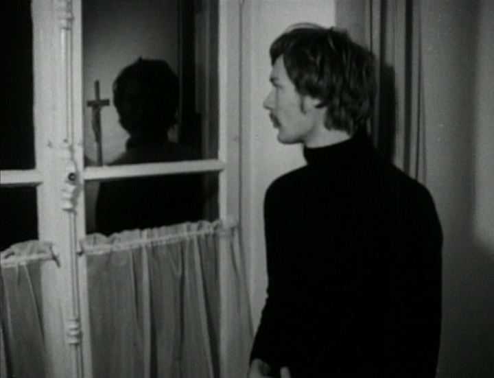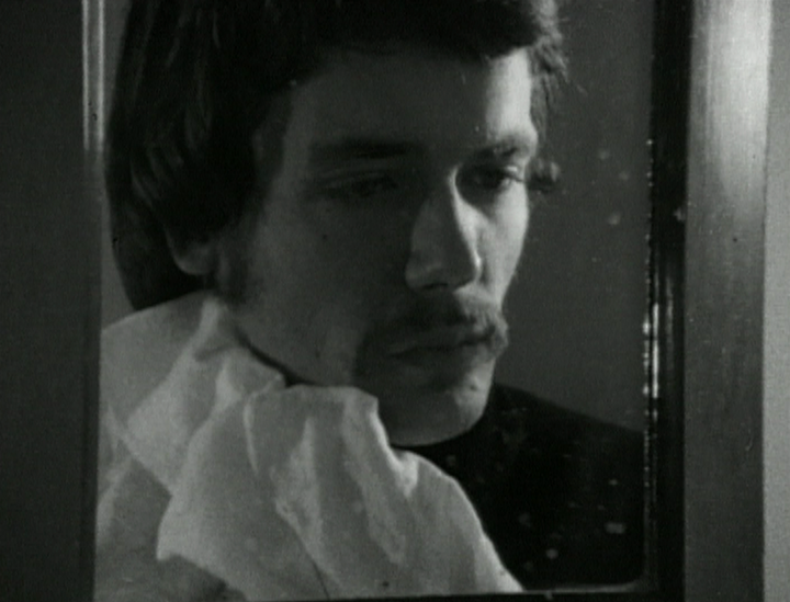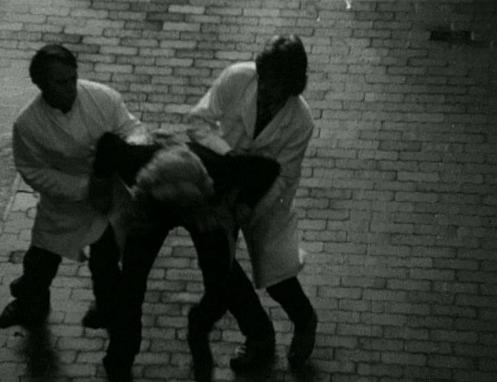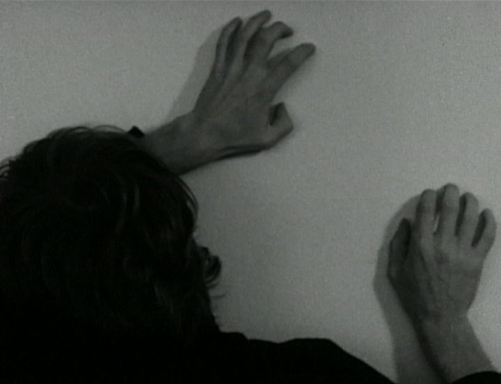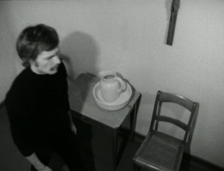 still from the film A WHITE WALLThis short film got its ispiration from Luigi Pirandello's theater-piece "Henry IV". An unsuccessfull composer of modern music who is locked up in a mental institution after attacking his wife is no longer able to distinguish between reality and his delusions of being a famous composer. The film was shot without sound. Music, dialogue and effects were added later. The film was edited without a moviola, the negative cut directly, as in the early years of film-making.