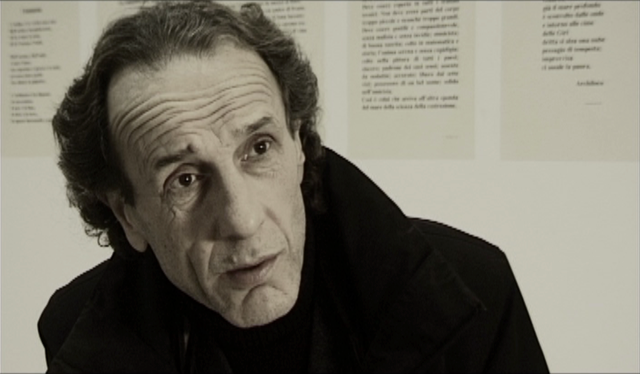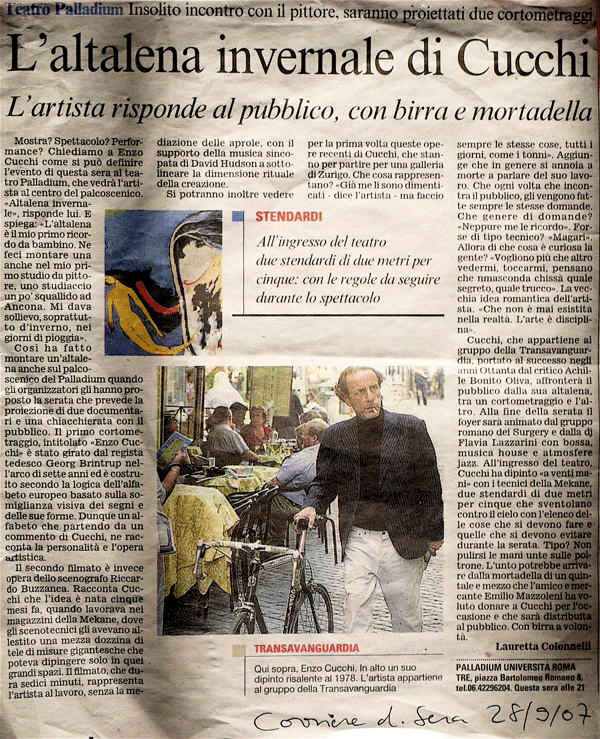 O artista tem a sua língua. É difícil compreendê-lo ao início. As suas frases não parecem seguir uma lógica comum. Fala com imagens, alegorias que parecem surreais, porque não são parábolas, nem símbolos. Muitas vezes, Enzo Cucchi usa a língua como um poeta que joga com as palavras, que se diverte com as associações. Não obedece as regras estabelecidas das leis da razão e da consciência. Para ele, não interessa o princípio racional, seus pensamentos são emocionais. A linguagem de Cucchi é próxima a um delírio, um fluxo contínuo de pensamentos e verdade que aparecem e desaparecem. Só quem se deixa levar, quem se desacelera com as ondas de suas palavras e de suas imagens, poderá acolher seu entusiasmo cósmico. Enzo é um alquimista que está procurando ouro. A metade de sua arte não é o ouro, mas, em vez, a sua procura em si.